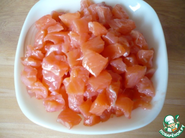 Затем каждый ломтик форели нарежьте мелкими кубиками.