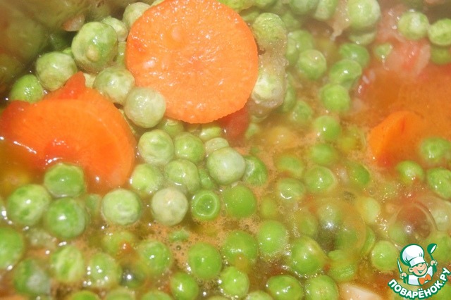 В глубокий сотейник или кастрюлю налить половину масла и поставить на огонь. Поместить в нее лук, натертый на крупную терку, чеснок целыми зубками, натертый без кожицы помидор, нарезанную на шайбы морковь и горошек (не размораживая, если он у вас замороженный).