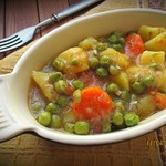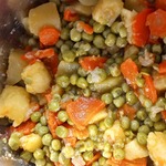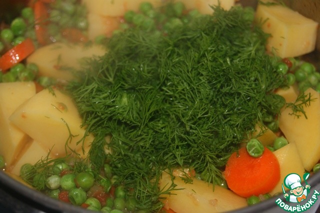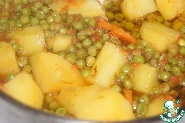 Снять с огня и влить оставшееся масло. Бульон почти весь впитался в картофель и горошек, часть его выкипела. Греки считают это блюдо - ладеро фагито (масленной едой).