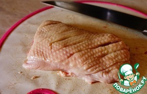 Утка, как все водоплавающие, птичка жирная. Поэтому важно из грудки вытопить жир. Для этого нужно сделать надрезы не коже, не зацепив мяса. У меня была относительно молодая утка и жир был не очень толстый. Поэтому я сделала надрезы только в одну сторону. Когда попадается уточка постарше с более толстой кожей, я делаю не ней «сеточку».