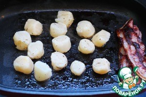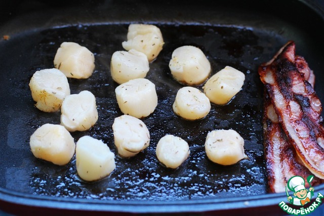 Гребешки промыть. На сухую сковороду выложить полоски бекона, обжарить их для получения ароматного жира для гребешков