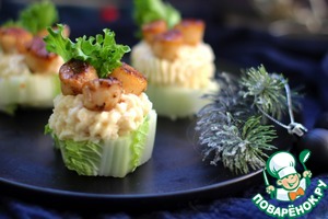 Можно подавать порционного. Например, на ломтиках огурца, листьях салата или кружках от пекинской капусты (у меня остались кочерыжки от салата, круглые и удобные)