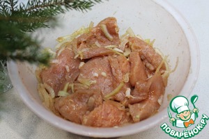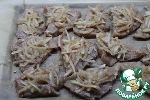 Мясо нарезать на кусочки и хорошо отбить с двух сторон. Лук нарезать полукольцами.