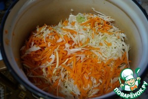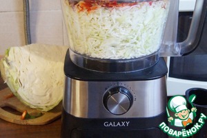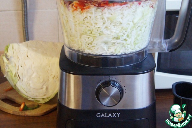 Белокочанную капусту очистить от верхних листьев, отрезать нужное количество. Горький перец освободить от семян и измельчить вместе с капустой при помощи комбайна.