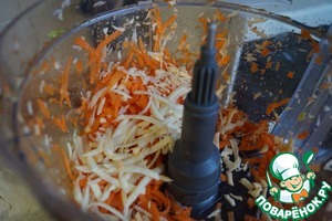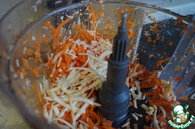 Морковь и пастернак очистить от кожуры и нашинковать в комбайне при помощи насадки "тёрка".