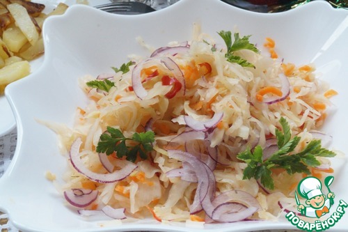 Перед подачей полить капусту душистым маслом и добавить лук. Мне больше нравится красный лук. Украсить зеленью.