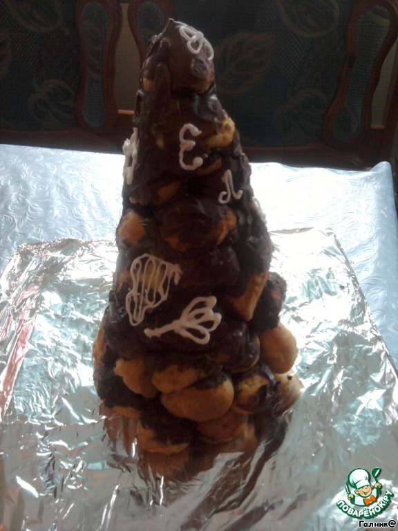 Первый раз о нeм услышала из фильма "Отчаянные домохозяйки"и решила сделать, вот представился случай-мой день рождения. Украсить не успела, гости оказались слишком пунктуальными. Это как-бы генеральная репетиция, думаю что на рождество представится возможность украсить. Смотрится он конечно очень торжественно, в высоту получился 48 см. Кол-во испечeнных профитролей 75, до сборки дожили 65 шт. Слишком большое искушение.