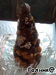 Затем делаем произвольный конус(в зависимости какой высоты вы хотите сделать торт),я сделала из старой коробки и скрепила скотчем, укладываем профитроли,предварительно смазав в растопленном шоколаде.Ставим в холодильник.