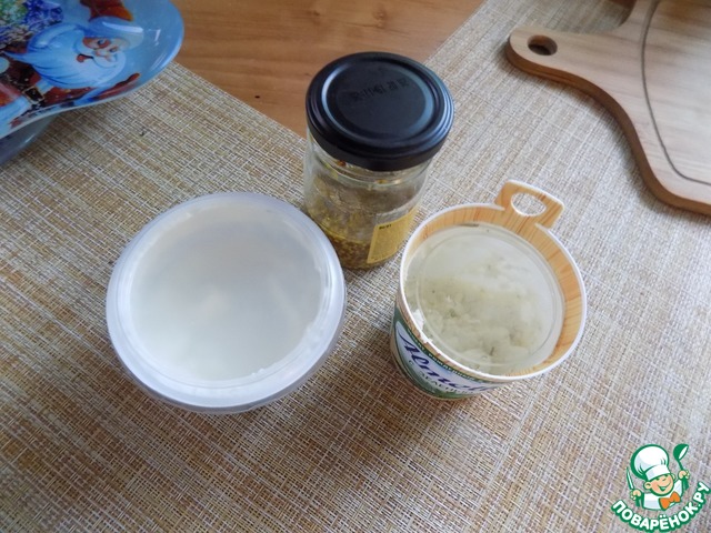 Заправку сделаю из сметаны, творожного сыра с зеленью (можно взять любой), зернистой горчицы и посолю по вкусу. Салат в салатнике не нужно заправлять. Заправку выложу на салат при подаче.