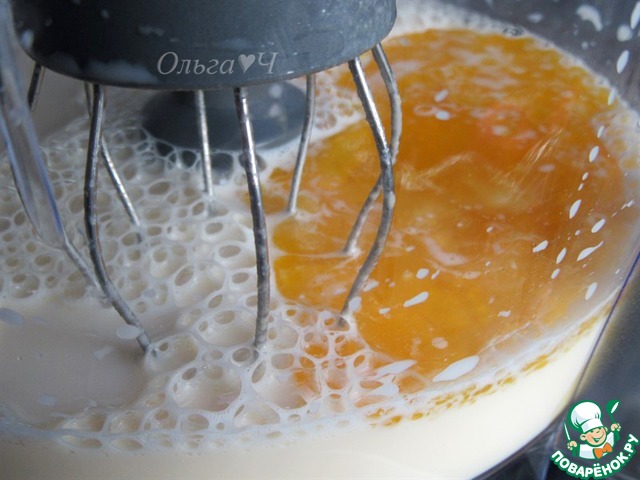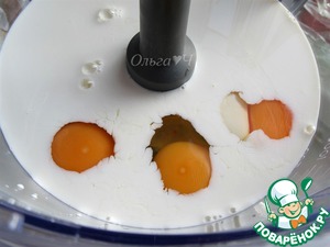 В чашу кухонного комбайна налить молоко и сливки, добавить яйца, взбить несколько секунд.