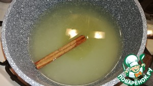 В небольшую кастрюльку налить лимонный сок, добавить сахар, мед, воду и палочку корицы. На небольшом огне довести до кипения, изредка помешивая. Вытащить палочку корицы и дать немного остыть.