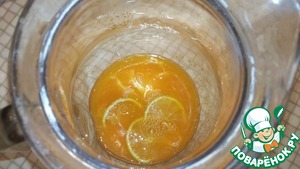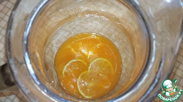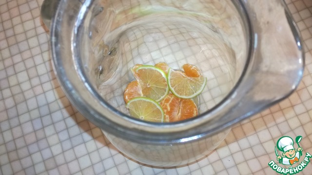 Один мандарин почистить, разделить на дольки и слегка подавить. Отправить в подготовленный графин, туда же порезать кружочками лимон (или лайм).