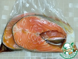 Стейки форели поместить в пакет и вылить в него маринад. Пакет завязать, перевернуть пакет несколько раз, чтобы рыбка пропиталась соусом. Оставить на полчаса в холодильнике, 1-2 раза переворачивая пакет.