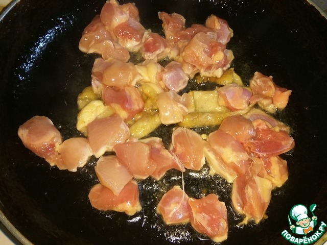 На растительном масле обжарить на среднем огне мясо вместе с кожей от бедер. Жарить помешивая 3-4 минуты.
