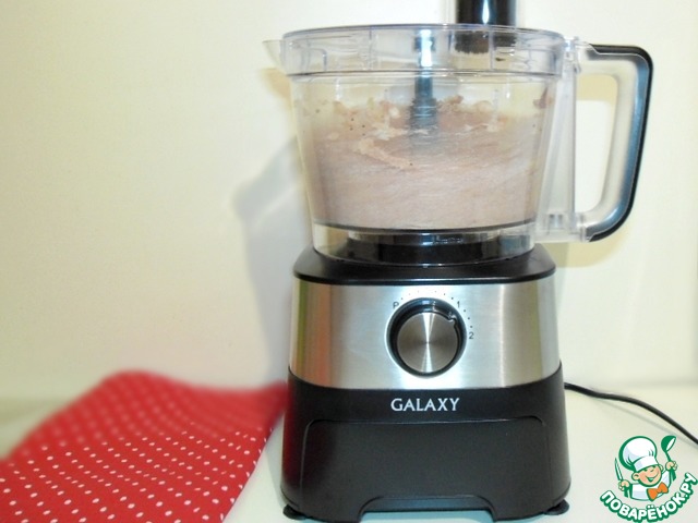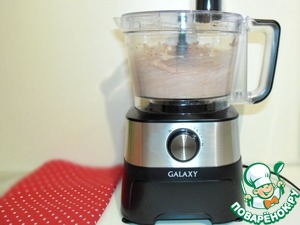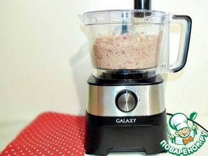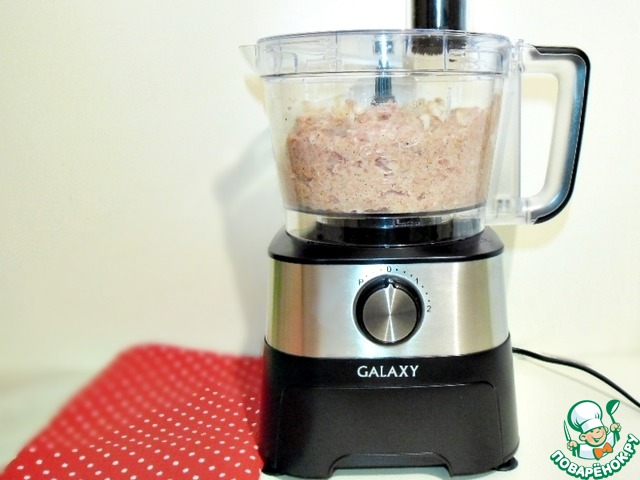 В чашу комбайна закладываю замаринованные мясо и лук вместе с соком. Буквально через минуту продукты измельчены. -