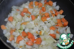 На горячую сковороду наливаем растительное масло и обжариваем морковь и лук на среднем огне при закрытой крышке 10 минут.