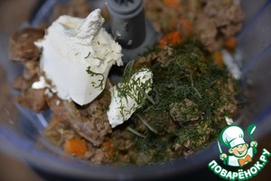 Кладём остывшую печень в чашу кухонного комбайна, добавляем творожный сыр и укроп (у меня замороженный).