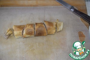 Отрезаем края рулета, они неровные и пустые. Острым ножом разрезаем рулет пополам и далее наискосок ещё пополам каждую часть.