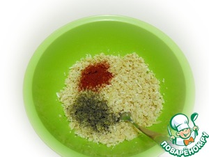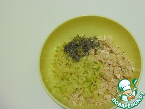 Добавить во вторую сырно-яичную часть. Всыпать сушеный зелёный лук, который впитает в себя сок кабачков.