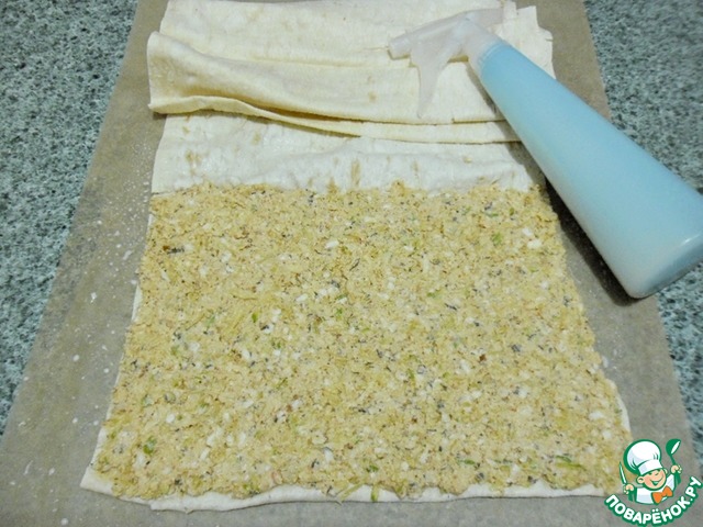 Молоко можно наносить на лаваш кистью, но я налила его в распылитель (он у меня для кулинарных дел, не подумайте чего).