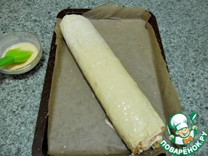 Затем перенесите на противень, развернув бумагу под рулет, лишнюю срежьте ножницами.