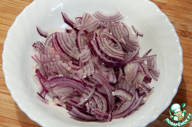 Нашинкованный лук переложить в миску и замариновать, добавив 0,5 ч. л. сахара, щепотку соли и 1 ст. л. лимонного сока.