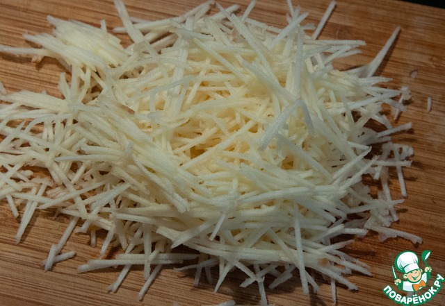 Яблоко почистить и нашинковать соломкой. Сбрызнуть оставшейся ложкой лимонного сока (что бы не потемнело)