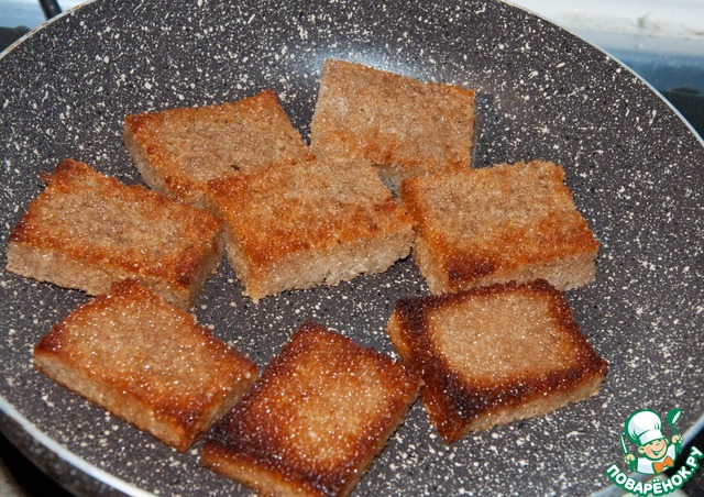 А можно заняться порционной закускай. Поджарьте кусочки чёрного хлеба на сковороде или подсушите в тосторе.