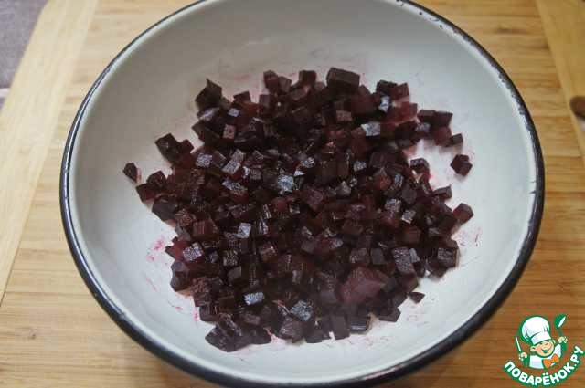 Свеклу остудить, снять кожицу, нарезать на мелкие кубики. Положить в миску.