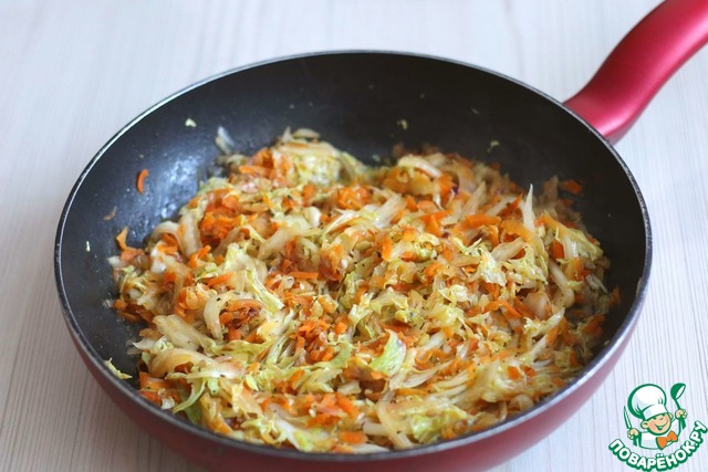 • На сковороду добавить 3 ст. ложки растительного масла, добавить нашинкованные морковь и лук. Пассеровать лук и морковь до легкой золотистой корочки, затем добавить 1/2 стакана воды и добавить к луку и моркови нашинкованную соломкой пекинскую капусту, смесь посолить, поперчить по вкусу. Капусту слегка припустить.
