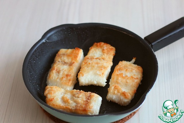 • Треску разделать на филе без кожи и костей. На сковороду добавить 3 ст. ложки растительного масла, кусочки трески запанировать в смеси муки и соли. Обжарить филе трески до готовности.