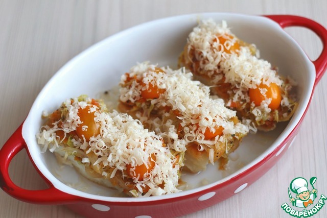 • В форму для запекания выложить обжаренное филе трески, на филе выложить обжаренные овощи (лук, морковь, пекинскую капусту), добавить сверху нарезанные помидоры черри. Сыр натереть на терке, присыпать рыбу и овощи натертым сыром. Форму отправить в разогретую духовку, подрумянить блюдо на гриле.