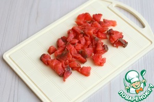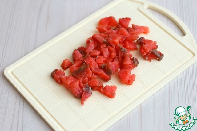 Копченую чавычу (150 гр.) нарезать мелкими кубиками.