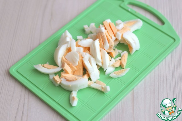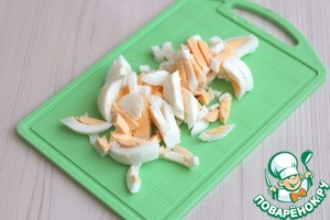 Яйца (2 шт.) отварить, нашинковать соломкой/кубиками.