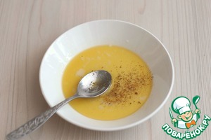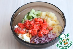 Соединить в емкости оливковое масло (3 ст. ложки), воду (1 ч. ложка), уксус 9% (1 ч. ложка), соль, черный молотый перец и сахар добавить по вкусу. Смесь хорошо размешать. Приготовленной заливкой заправить салат. -
