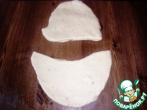 3. Из большей раскатать вытянутый овал к низу овал расширяем, а к верху делаем уже. Перекладываем овал на противень.