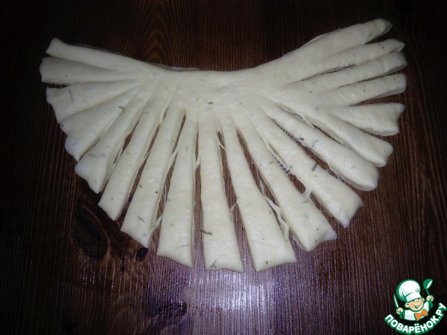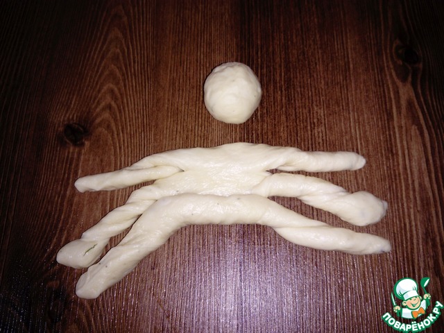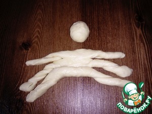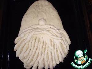 5. Одну часть раскатать и придать ей форму бороды, нарезать с помощью ножа для пиццы полоски, не доходя до верхнего края. А затем закручиваем каждую полоску.