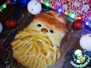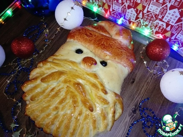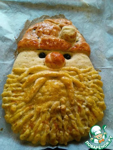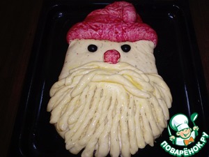 8. Из свёклы отжимаем сок ( сока нам понадобится 1 ст. л) сок можно заменить красителем. Сыр натираем на терке, маслины нарезаем колечками, две маслины оставляем целыми для глазок. Начинаем формировать деда мороза. На первый овал из теста в низу где будет борода выкладываем натертый сыр.