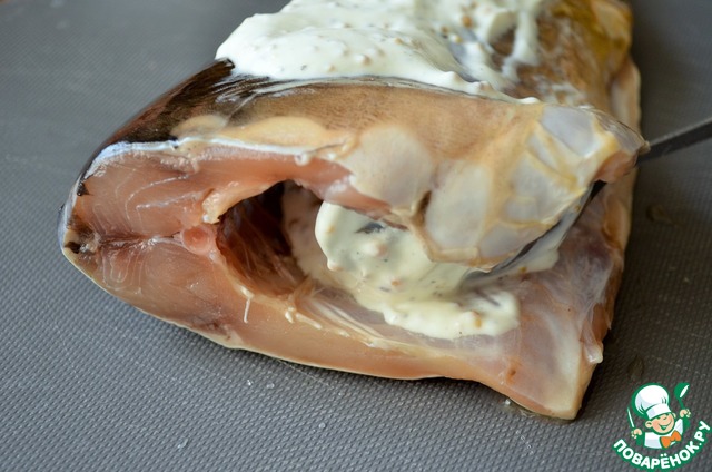 Карпа обсушить, обмазать смесью сметаны и перцев.
