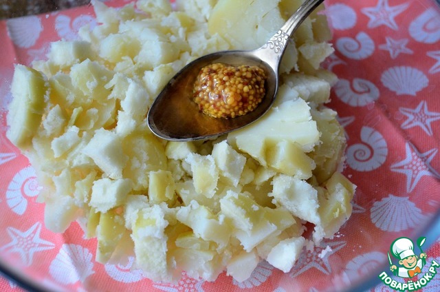 Картофель почистить горячим, порезать, добавить ароматное масло и горчицу, перемешать. -