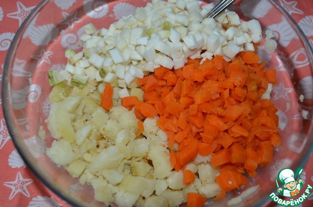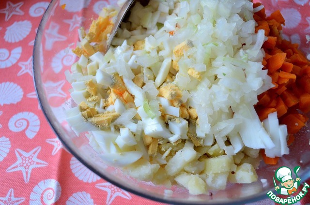 Лук заранее нарезать, залить кипятком, через пару минут, слить, промыть холодной водой, дать стечь. Выложить в салатник.