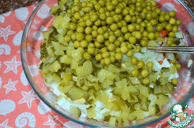 Добавить маринованный огурец (кубиком) и зелёный горошек.