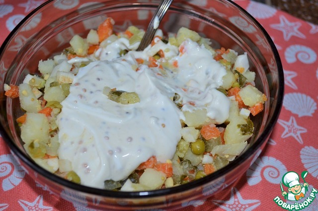 Смешать сметану, майонез, 1 ч. л. русской и 1 ч. л. зернистой горчицы.