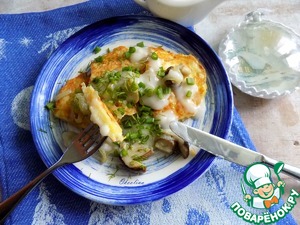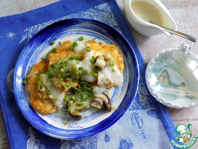 Сегодня идеальной парой мне послужат драники, на которые я выложу обжаренные грибы с луком и полью грибным соусом. По желанию сверху блюдо можно присыпать зеленью, что я и сделала.