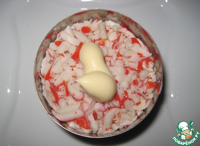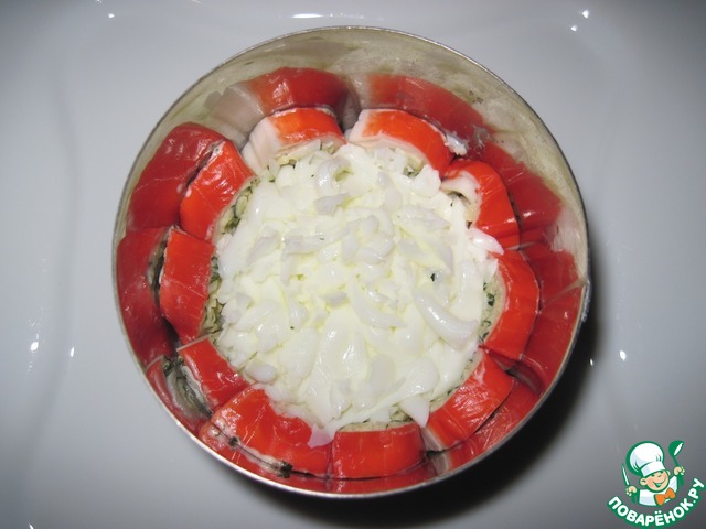 Рулеты из крабовых палочек аккуратно тонко нарезать и распределить внутри кулинарного кольца. Яичный белок натереть на крупной терке, выложить на дно кулинарного кольца первым слоем салата.