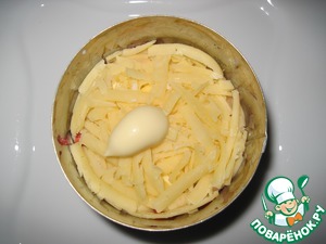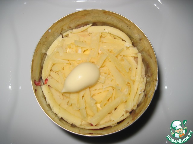 2 слой - вторая половина тертого сыра и немного майонеза,