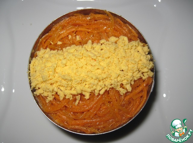 4 слой - морковь по корейски и "дорожка" из яичного желтка.