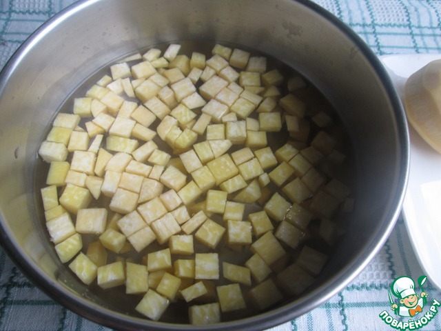 Репу очистить, нарезать кубиками и опустить в кипящую подсоленную воду на 2-3 минуты. Затем откинуть на дуршлаг.