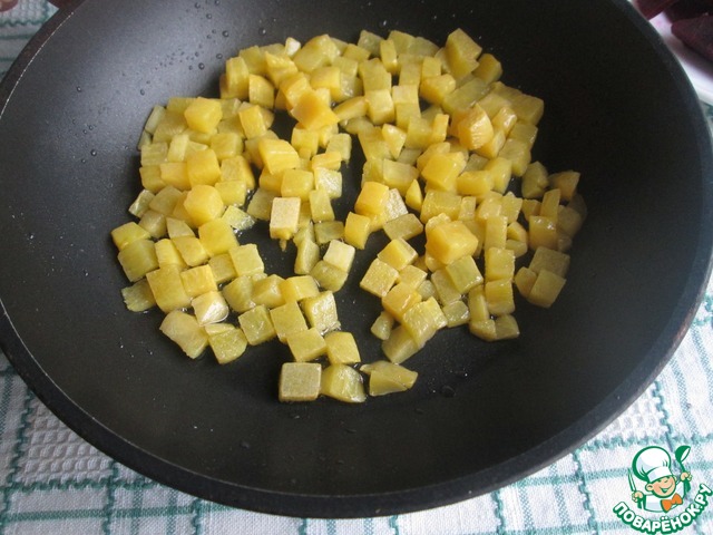 Репу обсушить и обжарить в 1-2 ст. л. растительного масла 5 минут. Я готовила на рафинированном подсолнечном масле.