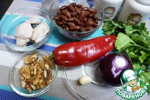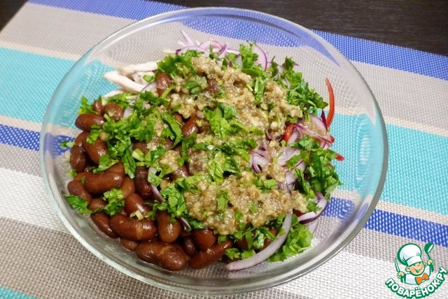 Мелко нарезать зелень кинзы и петрушки, помельче нарезать перчик чили (это по вкусу). Добавить зелень и орехово-чесночную заправку в салат.